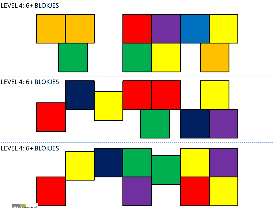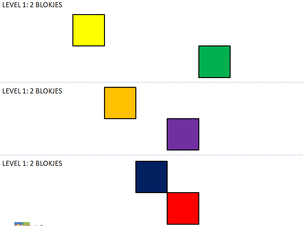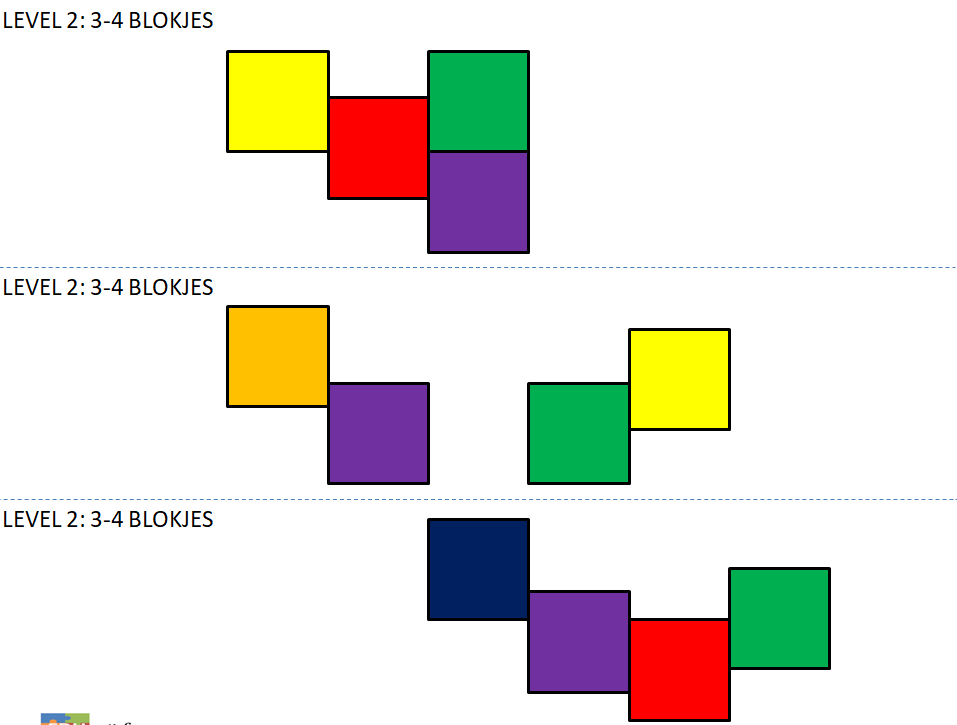 Print de kaarten uit. Knip de verschillende patroonkaarten op de stippellijnvan elkaar en lamineer ze. Begin met de kaarten op level 1 en bouw langzaam op. Het is de bedoeling dat de blokjes op dezelfde positie worden neergelegd als op de kaart staat aangegeven. Bij level 1 en 2 geef je het exacte aantal blokken bij level 3 en 4 geef je wat extra blokken om de moeilijkheidsgraad te vergroten.