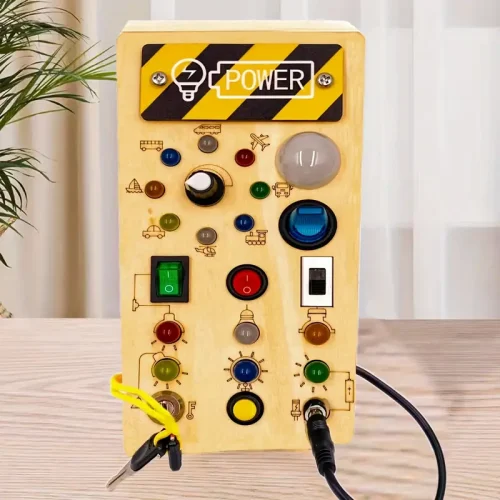 Met dit Houten Activiteitenbord Elektronica kun je je lekker vermaken met allemaal knopjes en lichtjes. Ieder knopje laat een ander lampje branden.