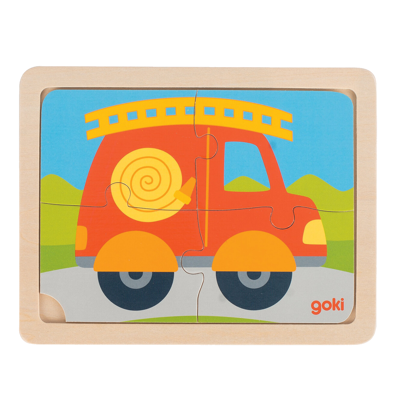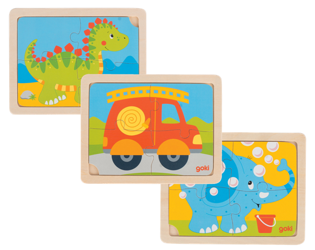 Leuke houten puzzel (4 stukjes). De puzzel is verkrijgbaar in drie varianten: brandweerauto, dino of olifant.