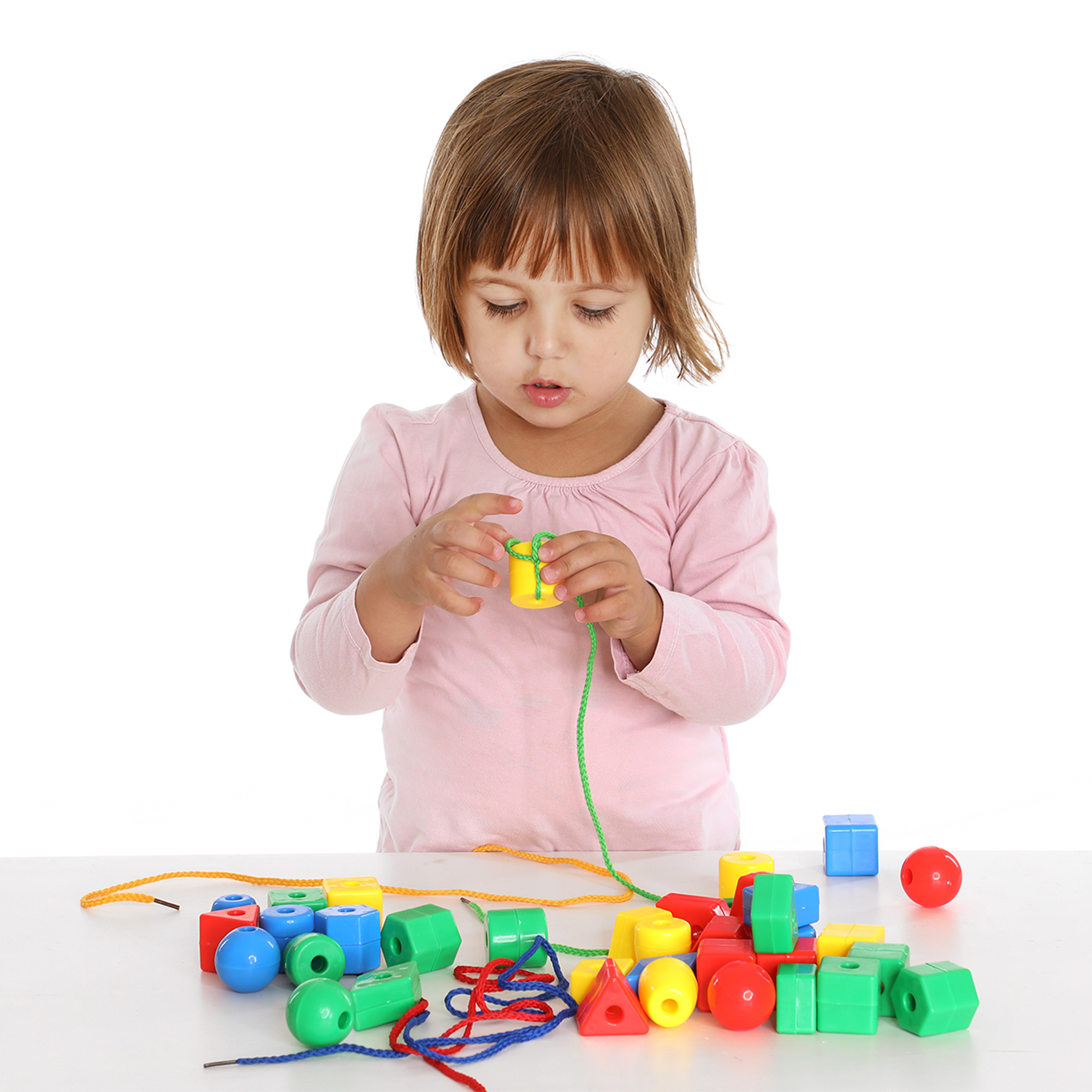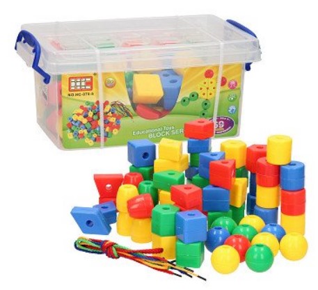 De set bevat 60 kralen van stevig kunststof in verschillende vormen. Inclusief 4 stukken koord met stevig uiteinde.