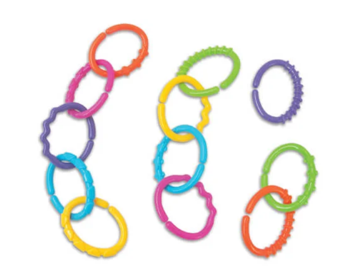 Gave veelkleurige Schakelketting. De schakels zijn hobbelig, bobbelig en kronkelig en geven een fijne sensorische ervaring. De zachte en flexibele plastic schakels zijn eenvoudig te verbinden.