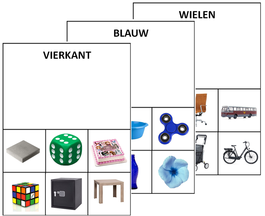Print de kaarten uit. Knip de verschillende kaarten van elkaar en lamineer ze. Tijdens het oefenen kun je de hoofdkaart de omschrijving van het kenmerk neerleggen. Leg bijvoorbeeld wielen en veren neer. Geef het kind de 12 bijbehorende kaartjes en vraag om deze te sorteren per kenmerk. Breid het aantal hoofdkaarten langzaam uit. Tip: Als je de set tweemaal afdrukt kun je de kaartjes gebruiken om te matchen op gelijken (B7 Identieke Afbeeldingen Matchen).