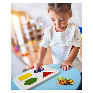 Dit setje bestaat uit kleurrijke veters en een foambord met daarop afgedrukt vier basisvormen: vierkant, driehoek, cirkel en zeshoek in de basiskleuren blauw, geel, groen en rood. De bedoeling is dat de vormen worden nagemaakt door het rijgen van de veters.